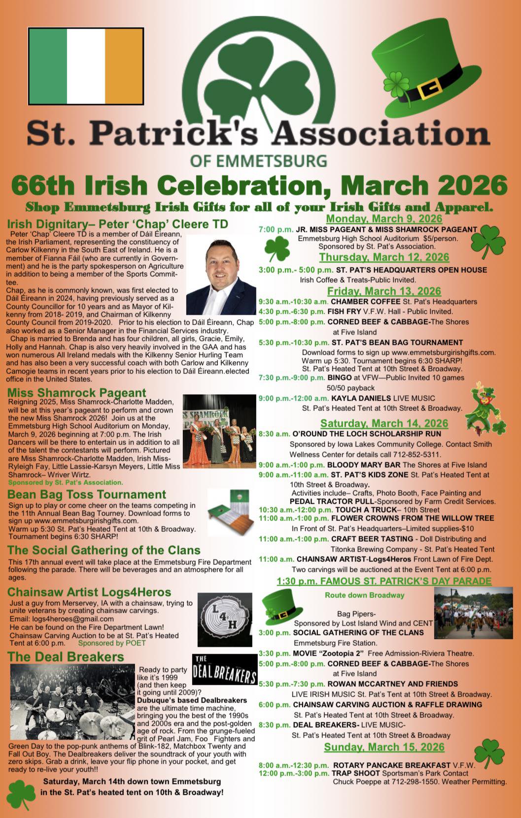 EmmetsburgIrishGifts.com for more information on Peter Chap Cleere and check out St Pat’s Association on Facebook for the full schedule of the 66th Annual St Patrick’s Association of Emmetsburg Irish Celebration.